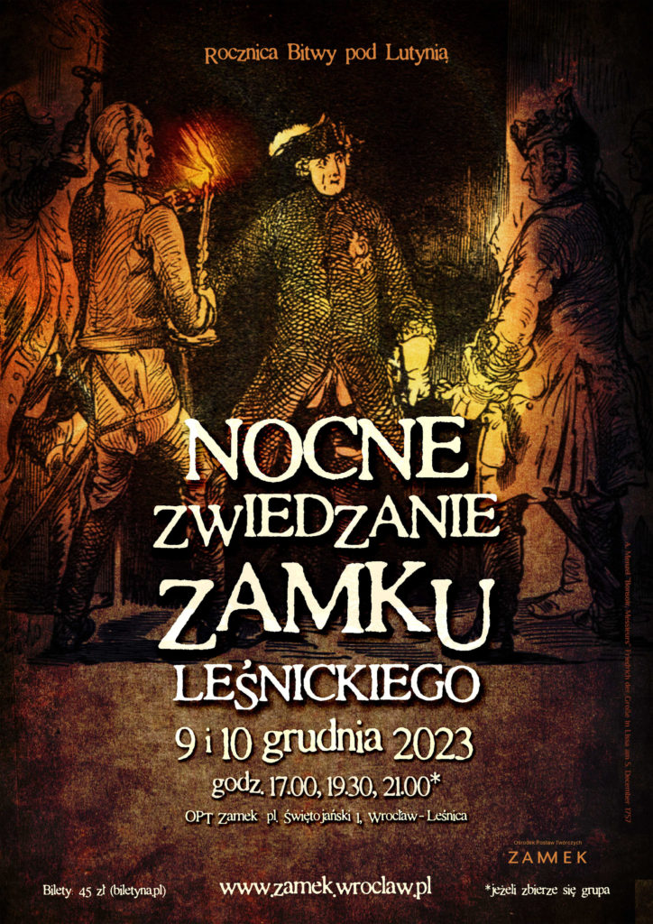 Wydarzenie „Bitwa pod Lutynią” przeniesie nas w czas brutalnych i krwawych wojen, które skoncentrowały się właśnie nieopodal Wrocławia. Uczestnicy trzeciej edycji nocnego zwiedzania, poznają bliżej postać króla, taktyki wojennej oraz przebiegu samej bitwy pod Lutynią, która rozegrała się 5 grudnia 1757 roku. Historia podąża śladami widma słynnego Króla „Fryca”, który po bitwie udał się właśnie do Leśnickiego Zamku, aby tam unieść kufel w geście zwycięstwa. „Psy! Czy chcecie żyć wiecznie?” – z takim okrzykiem wyskoczył przed szereg swych grenadierów, którzy cofali się przed ogniem nieprzyjaciela. Słowa i widok króla podziałały. Bohater, geniusz wojenny, nieubłagany szermierz sprawiedliwości, filozof czy może tyran?