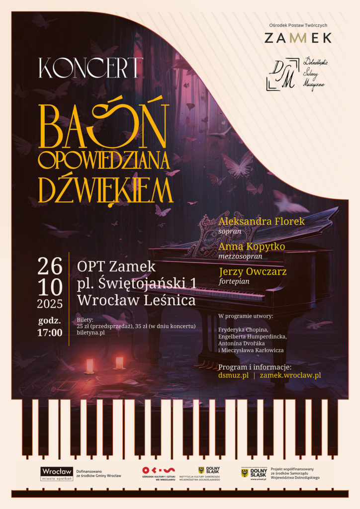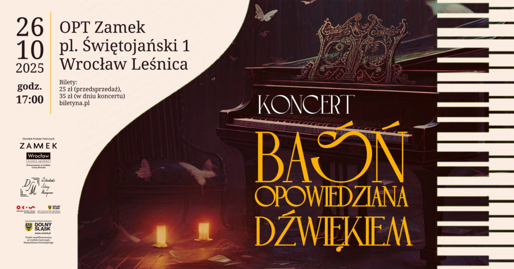 W niedzielę, 26 października 2025 roku, o godzinie 17:00 zapraszamy do Zamku na kolejne wydarzenie odbywające się w ramach Dolnośląskich Salonów Muzycznych – tym razem pod tytułem Baśń opowiedziana dźwiękiem.