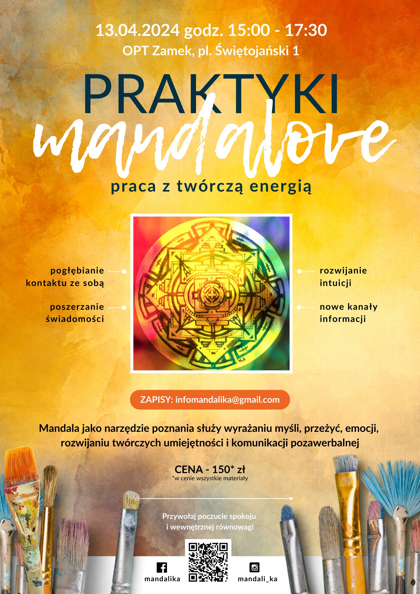 Mandala posłuży nam jako narzędzie poznania, wyrażenia swoich myśli i przeżyć, rozwijania twórczych umiejętności/ To kreatywny sposób nabywania i pogłębiania świadomości siebie, a w konsekwencji zwiększenia poczucia spokoju i wewnętrznej równowagi. Tworzona mandala pozwoli głębiej odczuć siebie i nawiązać kontakt z intuicją. Celem tych spotkań jest aktywowanie energii twórczej, otwieranie się na nowe możliwości i kanały informacji. Ten proces to forma kreatywnej medytacji i autorefleksji. Zajęcia dedykowane są dla osób ciekawych siebie, poszukujących głębszego kontaktu ze sobą. Praca z obrazem/mandalą, będzie nas prowadzić na spotkanie z naszym wewnętrznym nawigatorem.