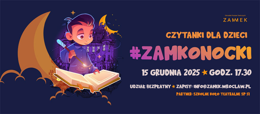Grudniowe „Zamkonocki” będą towarzyszyć jarmarkowym wydarzeniom, które odbywać się będą w naszym Zamku – z tej okazji zamiast 8 grudnia spotykamy się 15 grudnia, w poniedziałek, o godz. 17:30. Wyjątkowo będzie obowiązywała formuła otwarta, bez wcześniejszych zapisów. Tym razem czytanie dla najmłodszych przygotują uczniowie koła teatralnego w SP 51 we Wrocławiu.