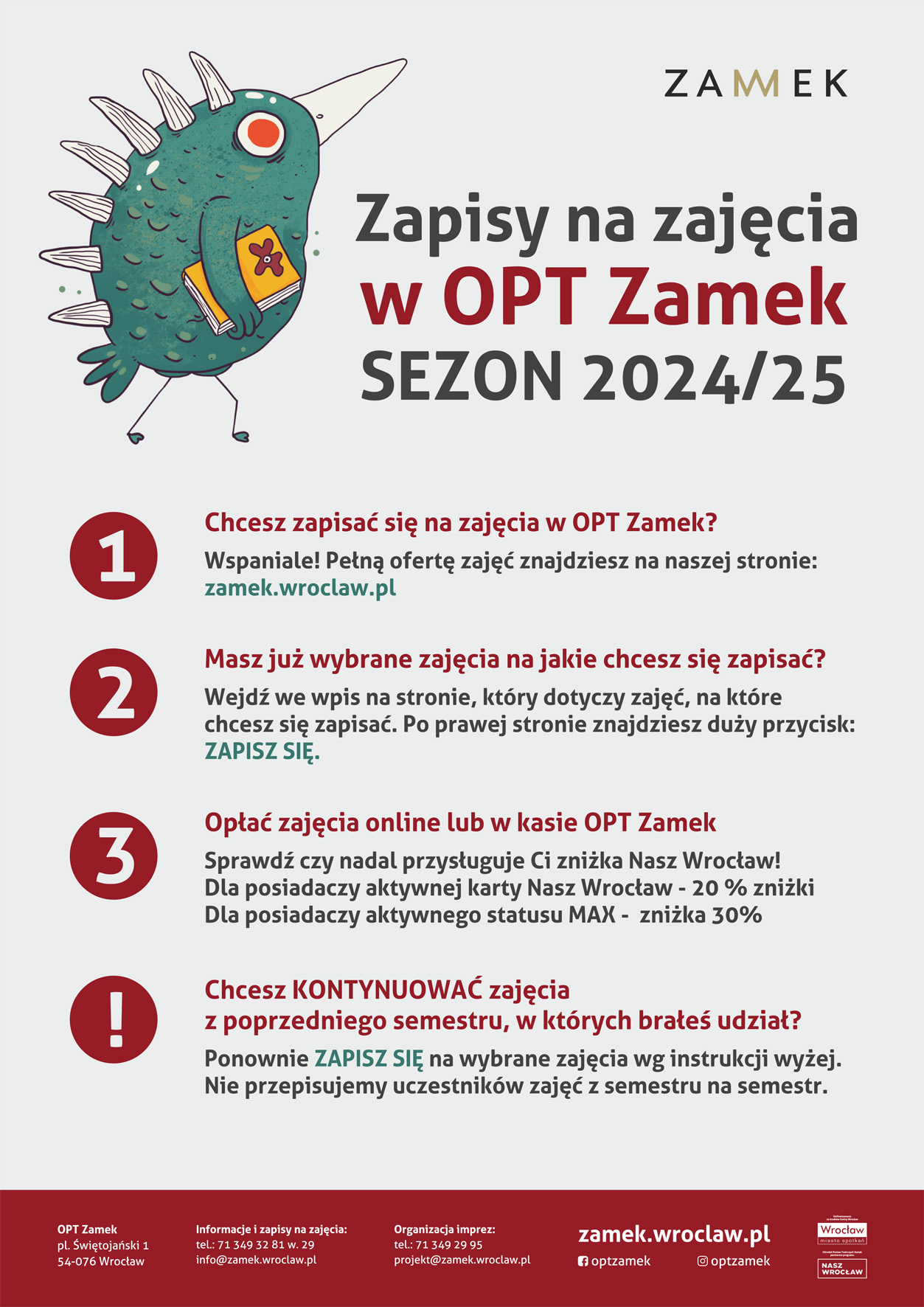 Oferta zajęć OPT Zamek dostępna jest w Strefie Zajęć. Kliknij, by dowiedzieć się więcej. Zapisy do pracowni odbywają się online oraz w recepcji Zamku.