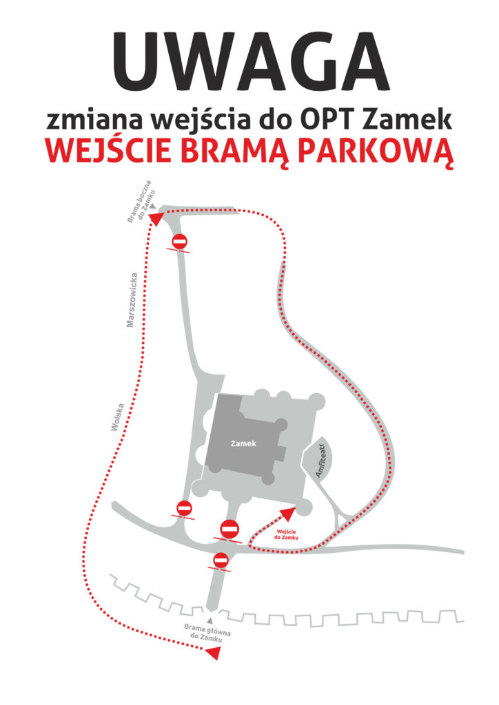 Zmiana ma charakter tymczasowy (remont tarasów). Pomimo utrudnień OPT Zamek funkcjonuje na normalnych zasadach. Przepraszamy za utrudnienia i zapraszamy na wydarzenia oraz zajęcia.