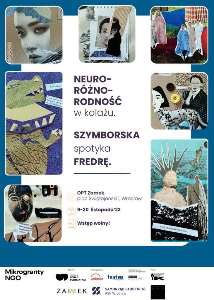 Zapraszamy na niezwykłą wystawę kolaży, które powstały w ramach Mikrograntu NGO „Neuroróżnorodnie z Szymborską i Fredrą” realizowanego przez Fundację Ponad Schematami. Te unikatowe prace, tworzone przy współpracy z Samorządem Studenckim Akademii Sztuk Pięknych im. E. Gepperta we Wrocławiu oraz Scenograficznym Kołem Naukowym są owocem kreatywnego spotkania mieszkańców i mieszkanek Wrocławia z wielkimi postaciami polskiej literatury.