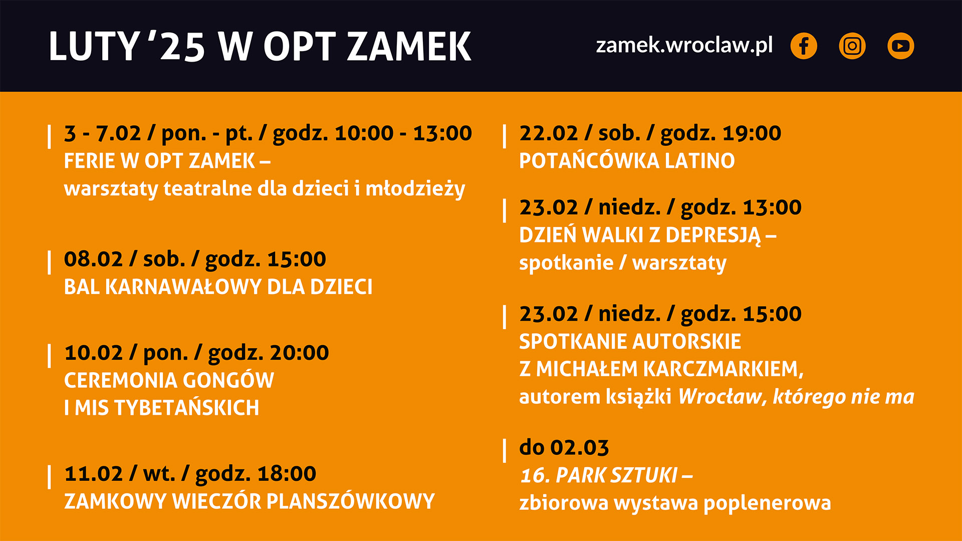 W lutym przygotowaliśmy dla Was bogaty program wydarzeń, które rozgrzeją serca i umysły podczas trwającej jeszcze zimy. Niezależnie od tego, czy szukacie kulturalnych wrażeń, rodzinnych atrakcji, czy sporej dawki edukacji, u nas każdy znajdzie coś dla siebie.